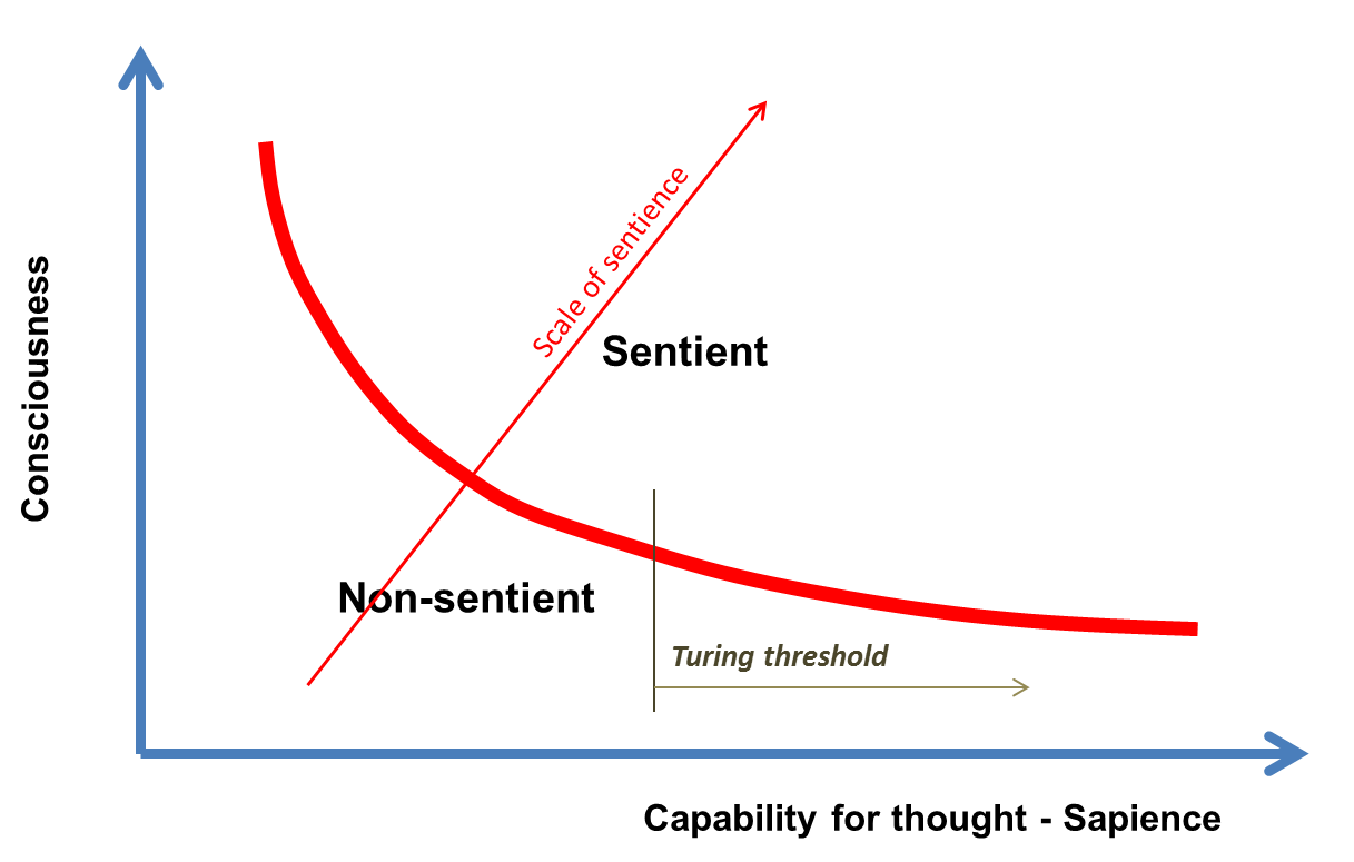 The Turing test is, I think, a test of reaching a particular level of sapience but it is not a test of sentience. But I also think that there is a scale of sapience. All “artifical intelligences” show varying levels of applying “thought” and could be said to be sapient to some degree. Sapience would seem therefore to be on a continuous scale. Many animals and birds also exhibit some level of thought and clearly exhibit different degrees of sapience. But chimpanzees and gorillas and dolphins and even elephants seem to recognise themselves in a mirror while monkeys do not. They would seem to have different levels of self-consciousness and – it would seem – different levels of sentience. I take gorillas and chimpanzees and maybe elephants to be sentient – just – but not dogs or cats. Is there then a scale of sentience which is constrained (or enabled) by, and depends upon, an entity’s position on a scale of sapience? I suspect that whatever it is I intuitively consider to be sentient depends upon a combination of sapience and the level of consciousness of self of an entity.