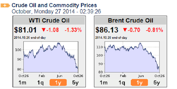 Reuters 27/10: Brent crude futures fell below $86 a barrel on Monday after Goldman Sachs cut its price forecasts for the contract and for U.S. oil in the first quarter of next year by $15.