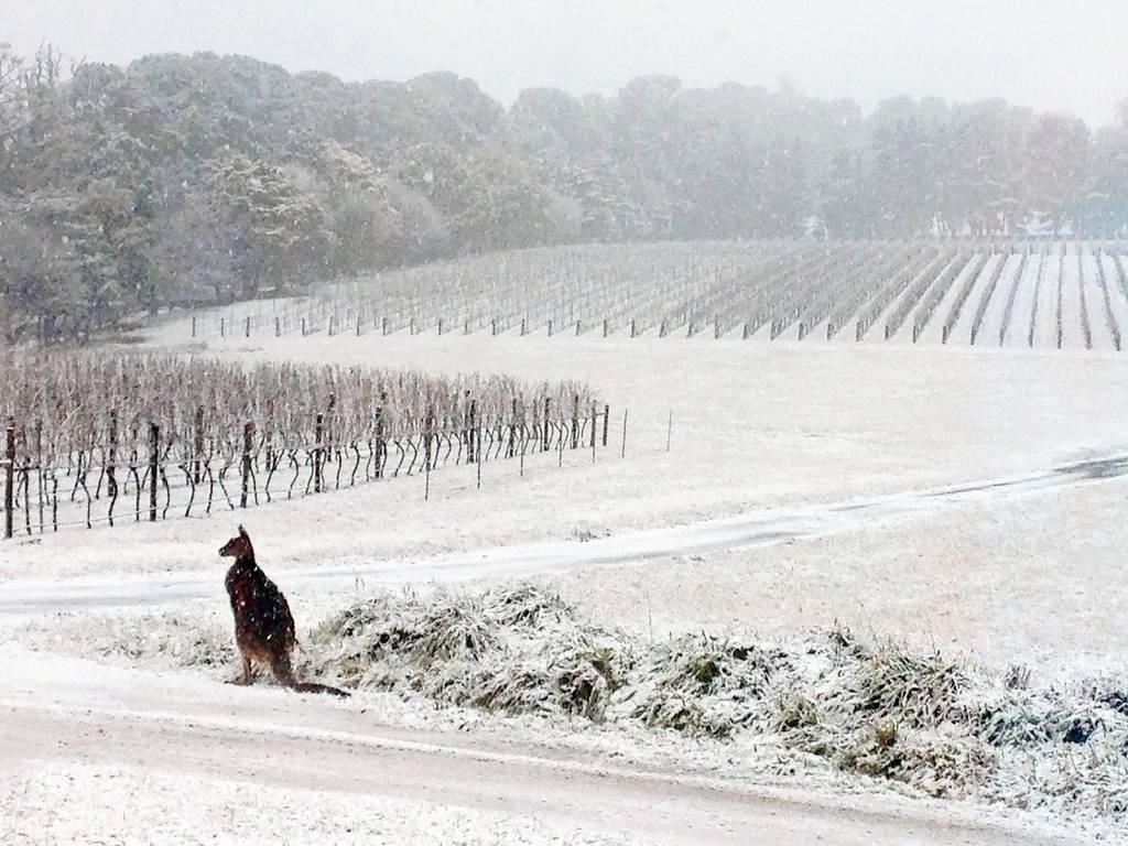 A kangaroo on the Colmar Estate vineyard in Orange, New South Wales, Australia during the winter storm – image AP