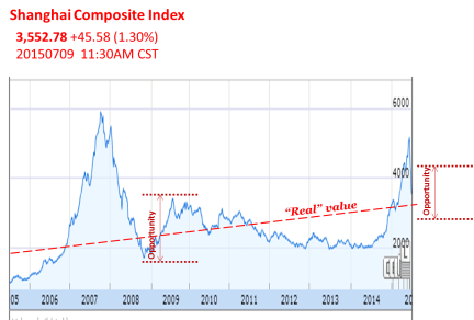 - I think the first has to be the Chinese markets (which embodies all the Chinese parameters). Irrespective of what happens elsewhere, the global economy needs the Chinese economy to stabilise and start moving upwards again. The bubble has burst but all the excess has not yet been expelled. The bottom for the Shanghai Composite Index lies at about 3100-3200. That is about 15% lower than current valuations. Because of recent forced share buying activities by the Chinese institutions the market distortions and the Chinese “slowdown” will run till November/ December this year. The Chinese “opportunity” will come when the SCI falls back to the level of the underlying, sans bubble, growth. The current value is just over 3500 (the same as about a month ago).