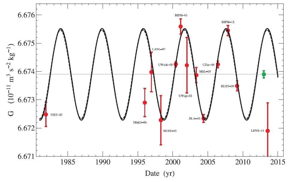 A set of 13 measurements of G exhibit a 5.9-year periodic oscillation (solid curve) that closely matches the 5.9-year oscillation in LOD measurements (dashed curve). The two outliers are a 2014 quantum measurement and a 1996 measurement known to suffer from drift. The green dot is an estimate of the mean value of G after the 5.9-year periodicity is removed. Credit: J. D. Anderson, et al. ©2015 EPLA