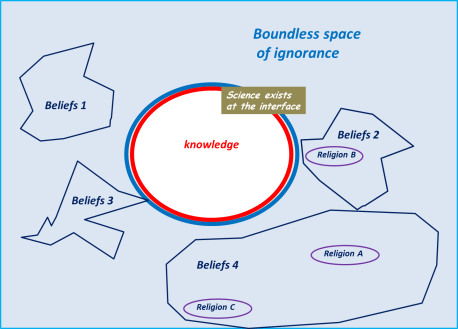 Belief, and religions, only exist in the “Space of Ignorance”. Any true belief ought to be the result of a cognitive-emotional process followed by every individual. It is hardly true belief when it is force-fed to children long before they have reached emotional or cognitive maturity.