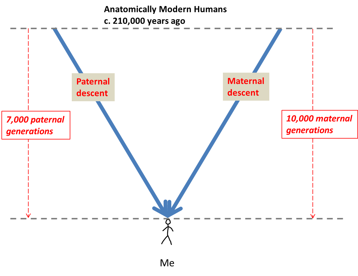 So my grandfather’s grandfather was born at about the same time as my grandmother’s, grandmother’s grandmother. From just about 1860, I am the product of 4 generations on my paternal line but of 6 generations on my maternal line. The same pattern is reproduced all the way back to when Anatomically Modern Humans began some 210,000 years ago and possibly even before that. But that means that everybody living today, for any given time period going back, has a maternal line of descent containing around 40% more generations than the paternal line of descent.