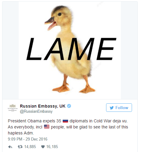 The Russians reacted to his expulsion of 35 diplomats with this tweet from the Russian Embassy in the UK.