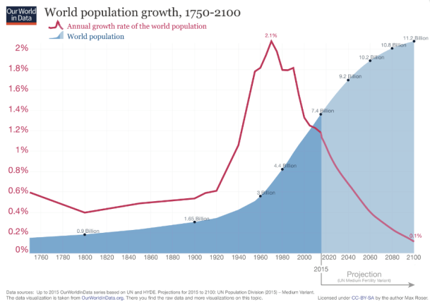 the rate of growth peaked in 1962 and has since been on the decline. The following visualization presents this comparison by superimposing the annual population growth rate over the total world population for the period 1750-2010, as well as projections up to 2100. In the projections you can see that by 2100, the growth rate is estimated to fall to 0.1%.