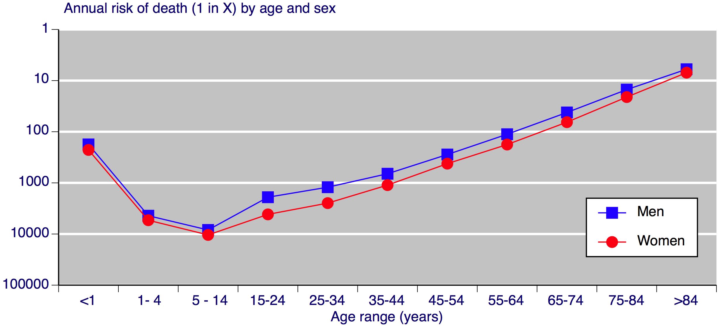 At 50 the probability of death is about 1: 300 but at the age of 80 this has increased to 1:20.