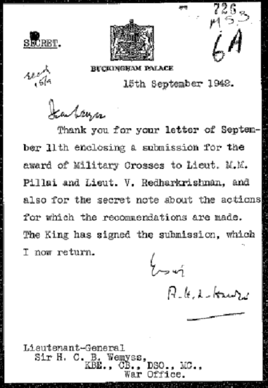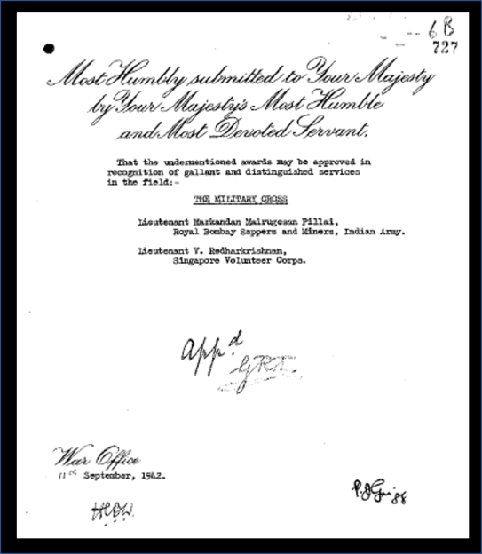 The documents below are the Royal Approval for that award initialed by King George VI on 11th September just two weeks after his return. He received the award from Field Marshal Wavell.