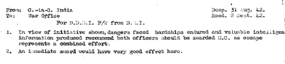 In 1942, the Allies were desperate for “good news” and the story of the escape was widely distributed – though labelled top secret – and only within Allied military circles. Recognition was rushed through as “Most Urgent” and he was awarded the Military Cross. However, the official documents remained secret for 50 years and were not released till 1992. Apparently the 50 year secret classification was because his debriefing included not only the names of people who had helped him along the way but also the names of people he felt were Japanese collaborators.