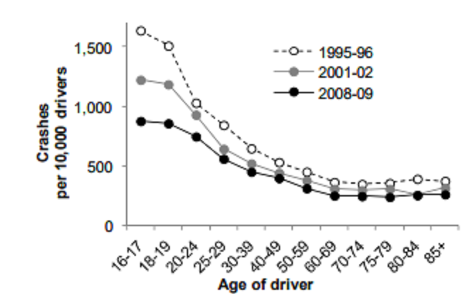 Data from the US also shows much the same thing. The safest drivers are around 75 years old. But even at 90 years old they are much safer than the 18-19 year old drivers. (AAA study).
