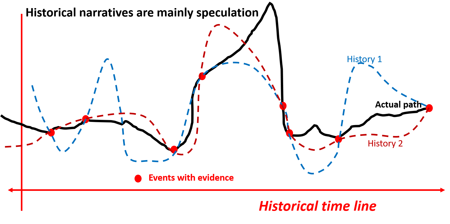 History is a narrative of the past, a story. It must be a story consistent with the present and with the available evidence of past events. The further back into the past we go the less is the surviving evidence. Evidence of a past event may be direct in the form of surviving documents or artefacts but it may also be indirect as calculations and estimates in the now about the past. The credibility of the narrative is enhanced by the weight of evidence that can be marshalled but – of necessity – the available evidence for past events , even in the immediate past, is always spotty and incomplete. Where evidence is not available the historian is free to speculate as long as his narrative includes those events for which evidence does exist and the entire narrative is credible.