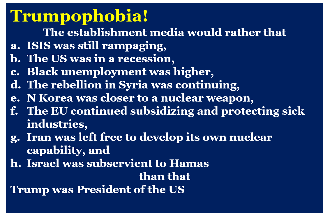 In years to come, Trumpophobia or the “Dump on Trump” syndrome will be studied as a classic example of mass irrationality or a mass political psychosis. Just his name seems to cause brain freeze among those afflicted with the phobia. But the affliction is debilitating. It causes otherwise rational people to sound and act like imbeciles.