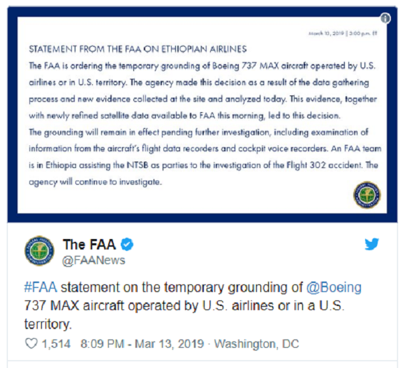 Up until Wednesday, the FAA position was that a review had showed “no systemic performance issues” and that there was no basis for grounding the aircraft.