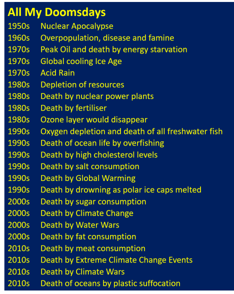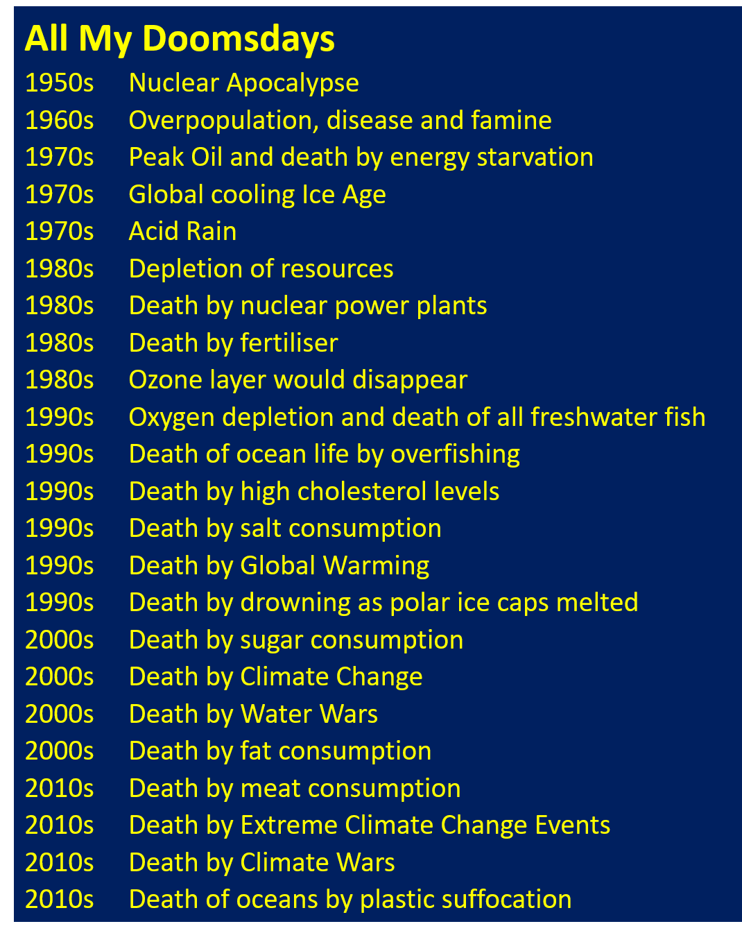 Nobody seems prepared to carry out sanity checks on the doomsday scenarios any longer. This is partly because the headlines and funding and fame that can be generated by alarmism is so lucrative. The key ingredients for any “successful” alarmist theme are: