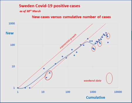 However, it is very difficult on the exponential growth section to be able to tell when the curve begins to flatten off. The growth of Covid-19 cases is better looked at, I think, in terms of new cases against the cumulative number of cases rather than just the traditional time-series. A caveat is that the number of positive cases depends upon the testing strategy. Nevertheless plotting the daily new cases against the cumulative cases on logarithmic scales is a better guide as to whether exponential growth is still occurring.