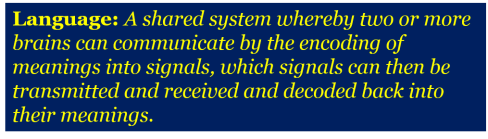 Language: A shared system whereby two or more brains can communicate by the encoding of meanings into signals, which signals can then be transmitted and received and decoded back into their meanings.
