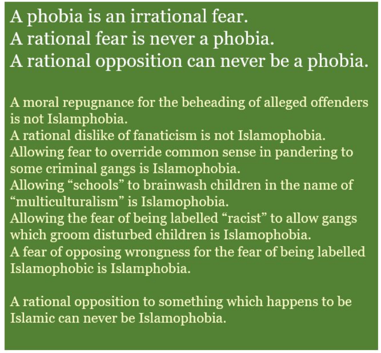 It is no longer politically correct to have an irrational fear of anything. There have been politically correct, but rather cowardly, reporters on Swedish TV who have even questioned whether the French teacher who was beheaded by an Islamic terrorist did not bear some responsibility for his own death.
