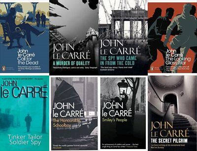 Call for the Dead (1961), A Murder of Quality (1962), The Spy Who Came in from the Cold (1963), The Looking Glass War (1965), Tinker Tailor Soldier Spy (1974), The Honourable Schoolboy (1977), Smiley’s People (1979), The Russia House (1989), The Secret Pilgrim (1990), A Legacy of Spies (2017)