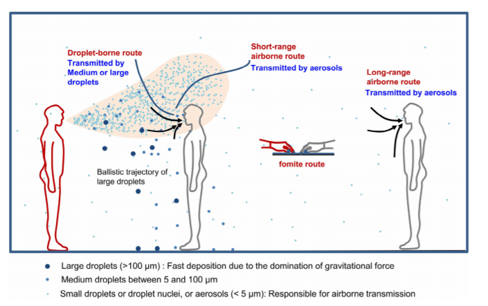 Airborne transmission is infection spread through exposure to those virus-containing respiratory droplets comprised of smaller droplets and particles that can remain suspended in the air over long distances (usually greater than 6 feet) and time (typically hours).