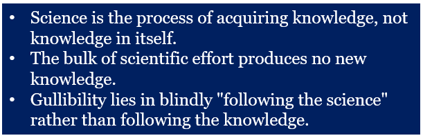 It is inevitable that the the bulk of scientific effort produces no new knowledge. Gullibility lies in blindly “following the science” rather than following the knowledge.