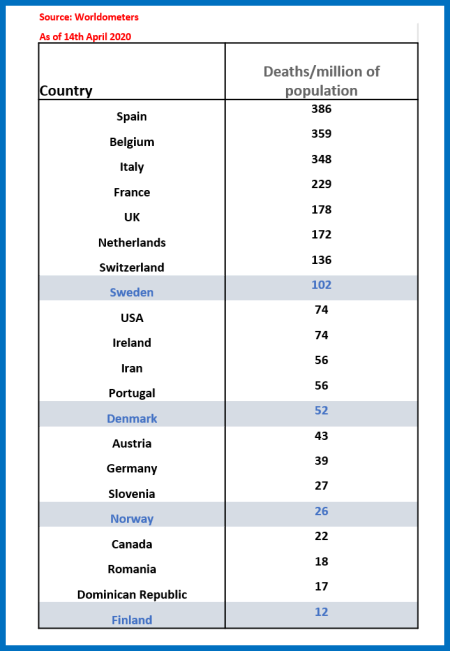 It has happened in Spain and Italy and the UK as well but I take Sweden as an example where the myth that human lives have equal value is particularly strong. It has become exceedingly clear that the lives of those who may place a greater burden on the nationalised health services are worth less than of those who won’t. Almost 90% of all deaths attributed to the coronavirus in Sweden, (actually 87% currently), are of those over 70 years of age. Many of these were because the infection entered the care homes where the elderly were trapped, mainly through asymptomatic care workers. Unions have then blocked care workers from providing care in some infected care homes. Government institutions have even formally promoted the downgrading of the value of the lives of the elderly. The Swedish Board of Health and Welfare (Socialstyrelsen) has explicitly lowered the priority to be given to those with a lower “expected remaining life”. It is not just coincidence that some Stockholm hospitals have rejected some of the elderly from available intensive care places, in case younger patients with a greater chance of survival might have need of them. (Expressen 23rd April)