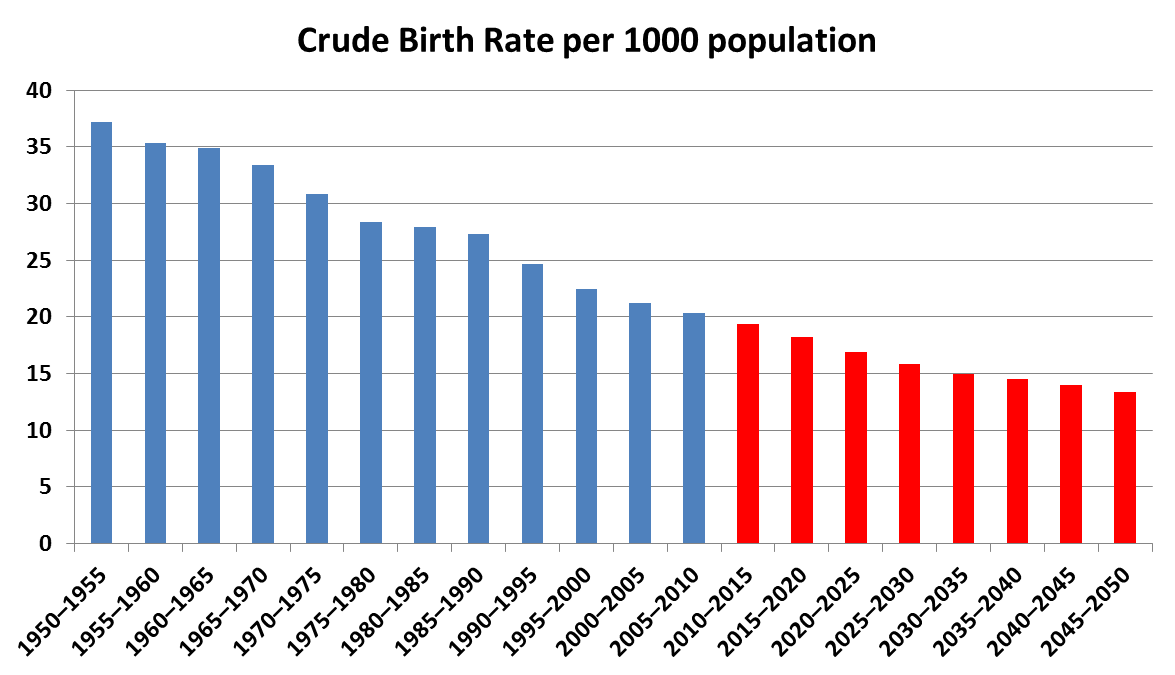 Currently the global birth rate is around 20 per 1000 of population (2%), having been around 37 in 1950 and projected to reduce to around 14 (1.4%) by 2050.