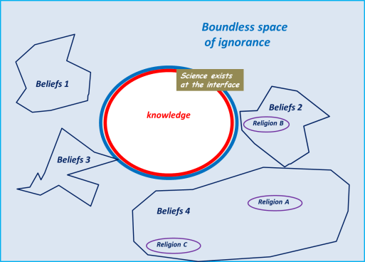 The known and the unknown are realms that are self-apparent. Science is the process at the interface of these regions which leads to the growth of the region of the known. All beliefs by definition lie in the region of the unknown. Any statement and its negation ( X and not-X) must both either lie in the region of knowledge, or both in the region of the unknown. It is not possible for one to live in the realm of knowledge and its negation to live in the region of the unknown. A belief in gods lies in the unknown. A lack of belief in gods (which is atheism) is not in itself a commentary on that belief. A denial of the belief in gods cannot then be anything other than belief and cannot shift into the realm of knowledge. A denial of a belief – which by definition lies in the unknown – is to claim knowledge of an unknown thing which is self-contradictory.