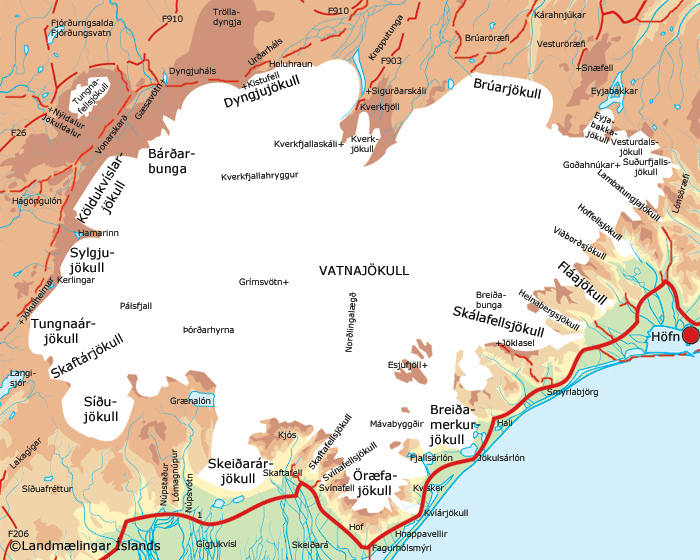 The volcano is hidden beneath the northwestern part of the Vatnajökull glacier, and contains a 700-m-deep caldera that is hidden beneath ice and has extensive flank fissures, from where eruptions have taken place: the Veidivötn fissure extends for over 100 km to the SW, almost reaching Torfajökull volcano, while the Trollagigar fissure extends 50 km to the NE touching Askja volcano.