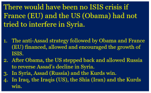The US has a well established track record now of creating the very monsters which then becomes their greatest enemies. Obama – in spite of his reputation of over-analysing issues – clearly did not foresee how his inaction in Iraq, and his misguided regime-change actions in Syria, would cause the explosive growth of ISIS. And Clinton, who had little understanding of the complex relations in the Middle East, couldn’t cover for Obama’s blind spots and had no real strategy of her own to bring to the table. Furthermore, Obama and Clinton (and later Kerry) have done little, if anything, to stop ISIS being financed from Saudi Arabia and the Gulf States.