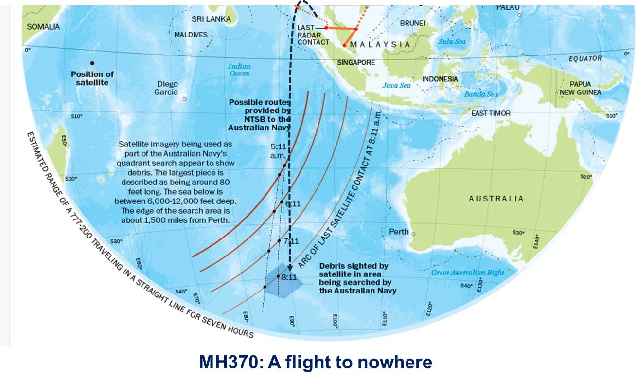 The debris is about at the fuel limit for the aircraft and it could have crashed after running out of fuel. That the plane was flying for so long (7 – 8 hours) on a trip to nowhere gives some credence to a long flight on autopilot with the pilots incapacitated. It seems unlikely that both pilots were in a suicide pact. Perhaps they were incapacitated after a deliberate – but partial – introduction of a new course. Could one of the pilots have set the whole thing up and then been discovered by the other, leading to a struggle where they “took each other out”. Perhaps the new course had not been fully reprogrammed leaving the auto-pilot on a flight to nowhere with two incapacitated pilots in a locked cockpit?????