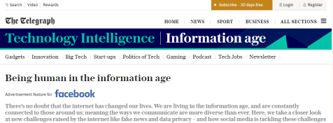 “Fake news, cyberbullying, artificial intelligence – it seems like life in the internet age can be a scary place,” the articles say. “That’s why Telegraph Spark and Facebook have teamed up to show how Facebook and other social media platforms are harnessing the power of the internet to protect your personal data.”