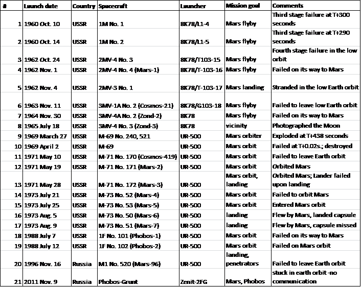 Phobos-Grunt is still circling Earth at an altitude between 128 miles and 210 miles after launching Tuesday from the Baikonur Cosmodrome in Kazakhstan for Mars buit is dead and silent. The jinx goes on and it is now 21 Russian missions to Mars which have failed their main mission goals: