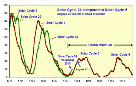 The September sunspot numbers are now out and it would seem that Solar Cycle 24 has passed its maximum. It looks very much like SC23, SC24 and the coming SC25 will be comparable to SC4, 5 and 6. Solar Cycles 5 and 6 were responsible for the Dalton Minimum. SC 24 and 25 will constitute the Landscheidt Minimum and we can now expect some 25 additional years of global cooling (which has of course already started – about 6 or 7 years ago).