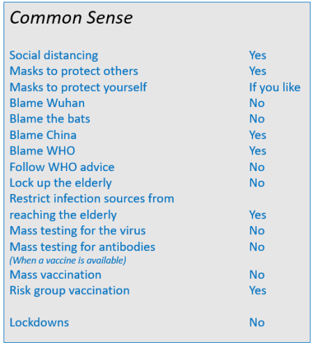 In the absence of a vaccine we are being led (or misled) by politicians blindly following the epidemiologists’ speculations about both the characteristics of the unknown virus and about social behaviour. In the space of 4 months the “best” epidemiologists at the WHO have changed their view of the Wuhan virus from being “non communicable between humans”, to “communicable by liquid droplets between humans”, to now be of “air borne transmission”. The experts have been divided whether transmission is from the symptomatic or from the asymptomatic. There are as many speculative views about when herd immunity can be achieved as there are epidemiologists. No one really knows. Art not science. Herds are always moving and herd immunity depends upon leaving the weak behind. Public policy is floundering as it staggers from lockdowns to no lockdowns to social distancing, from masks to no masks to some masks to masks for some, and from testing those with symptoms to restricted testing to mass testing. There is no certainty about whether testing is to be for the virus or for antibodies to the virus.